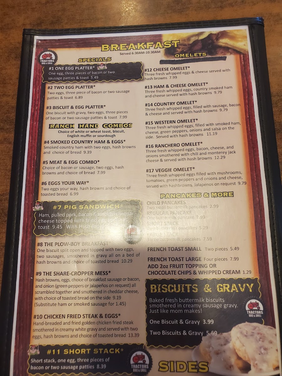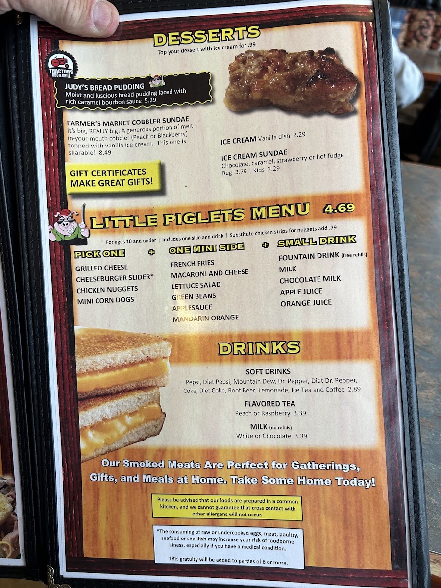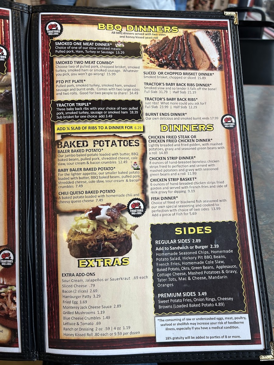 Breakfast lovers will delight in their pancakes and French toast options, ideal for kickstarting your day right. Desserts like the blackberry cobbler promise to wrap up your meal on a sweet note, embodying that classic, comforting homemade feel. Whether you're a local or just passing through, the inviting atmosphere and attentive service make Tractor's a must-visit destination for barbecue aficionados and families alike.
