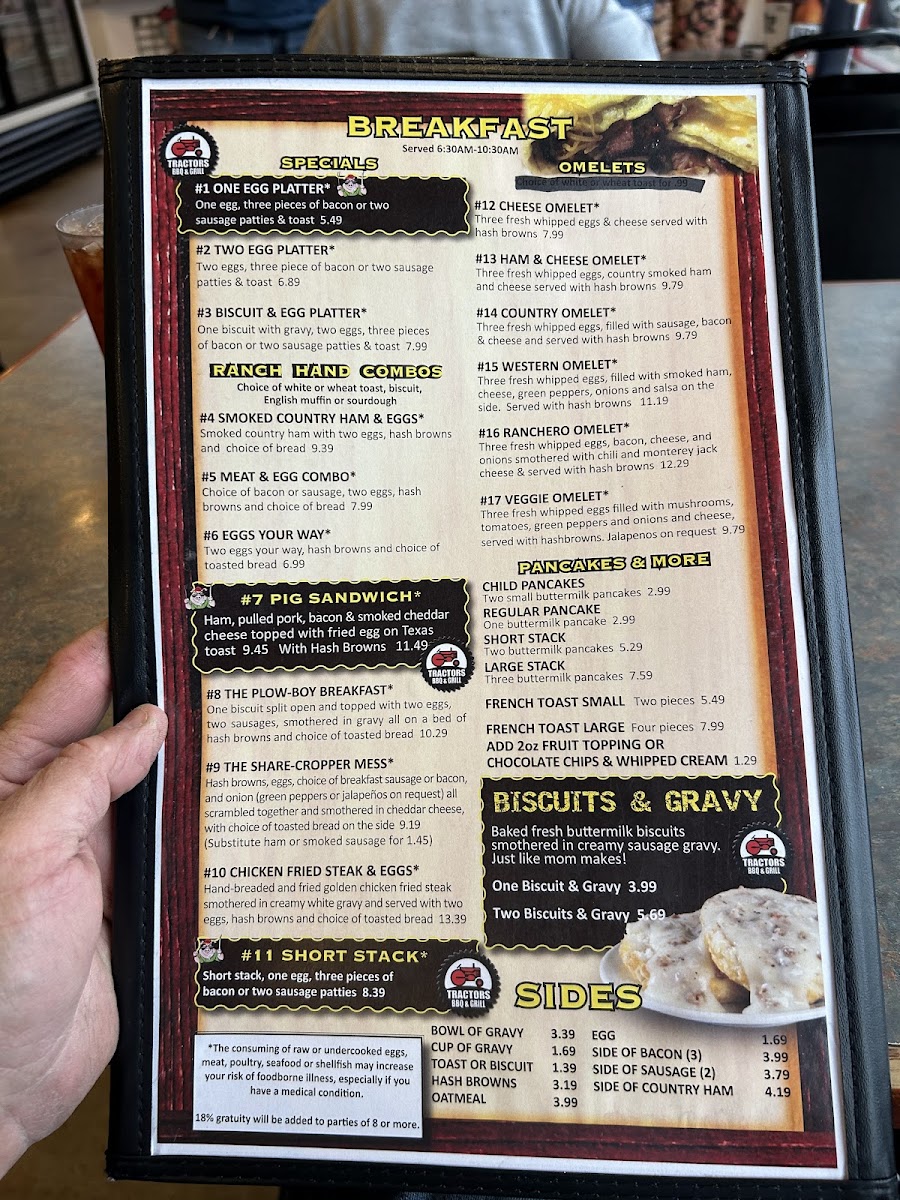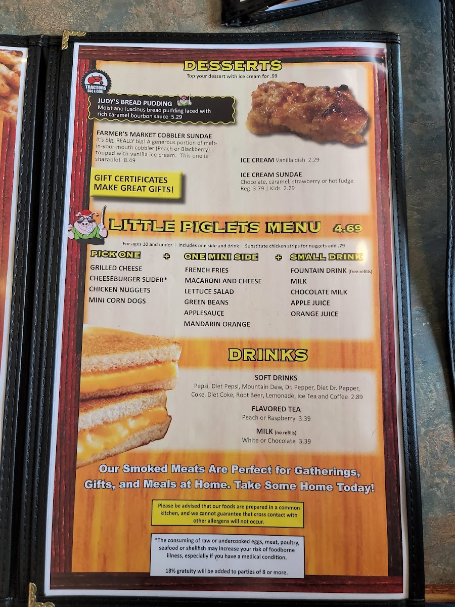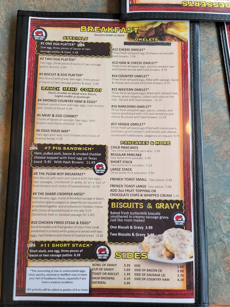 Breakfast lovers will delight in their pancakes and French toast options, ideal for kickstarting your day right. Desserts like the blackberry cobbler promise to wrap up your meal on a sweet note, embodying that classic, comforting homemade feel. Whether you're a local or just passing through, the inviting atmosphere and attentive service make Tractor's a must-visit destination for barbecue aficionados and families alike.
